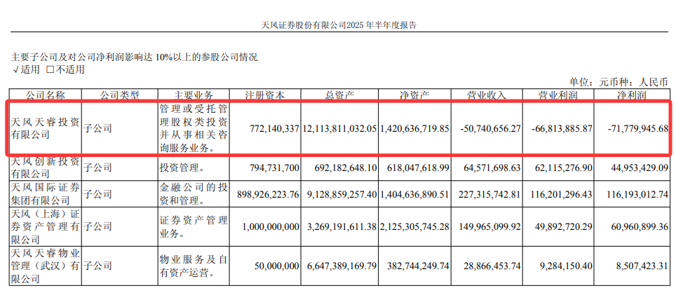 据天风证�年半年报,天风天睿是天风证券的全资子公司,主要业务为管理或受托管理股权类投资并从事相关咨询服务业务。截�𻂎月末,天风天睿及下属机构共管理备案基金数�只,认缴规模�.91亿元,实缴规模�.92亿元。天风天�年上半年实现净利润为-7177.99万元,营业利润为-6681.39万元,营业收入为-5074.07万元,总资产�.14亿元,净资产�.2亿元。